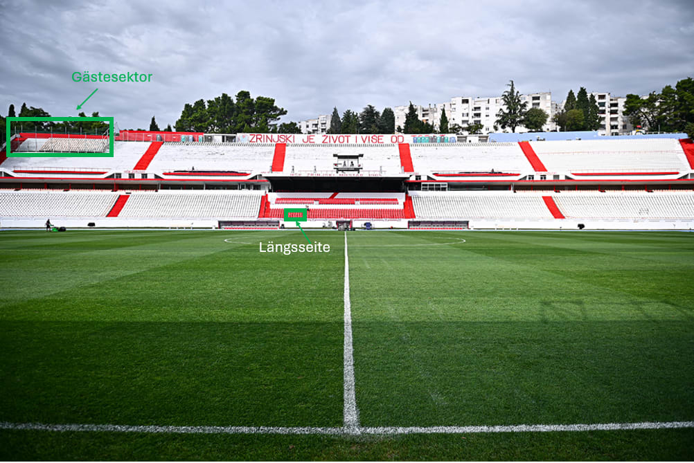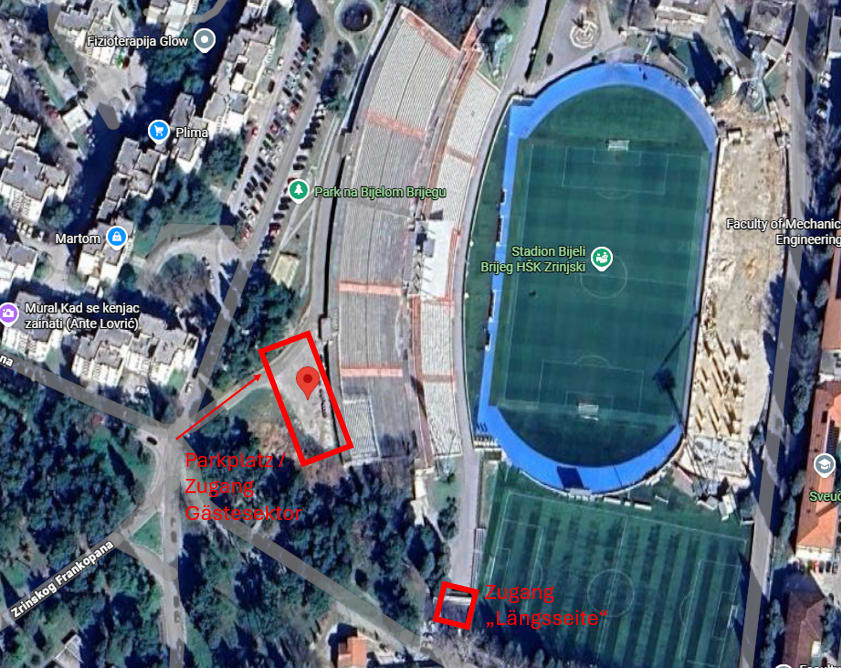 Der Zugang zum Gästesektor ist über die Straße Zrinskog Frankopana und dann über den Eingang "Gate 4" des Stadions möglich. Direkt vor dem Eingang zum Gästesektor wird es auch eine Parkmöglichkeit für all jene Rapid-Fans geben, die mit Bussen oder PKWs anreisen (siehe Skizze).