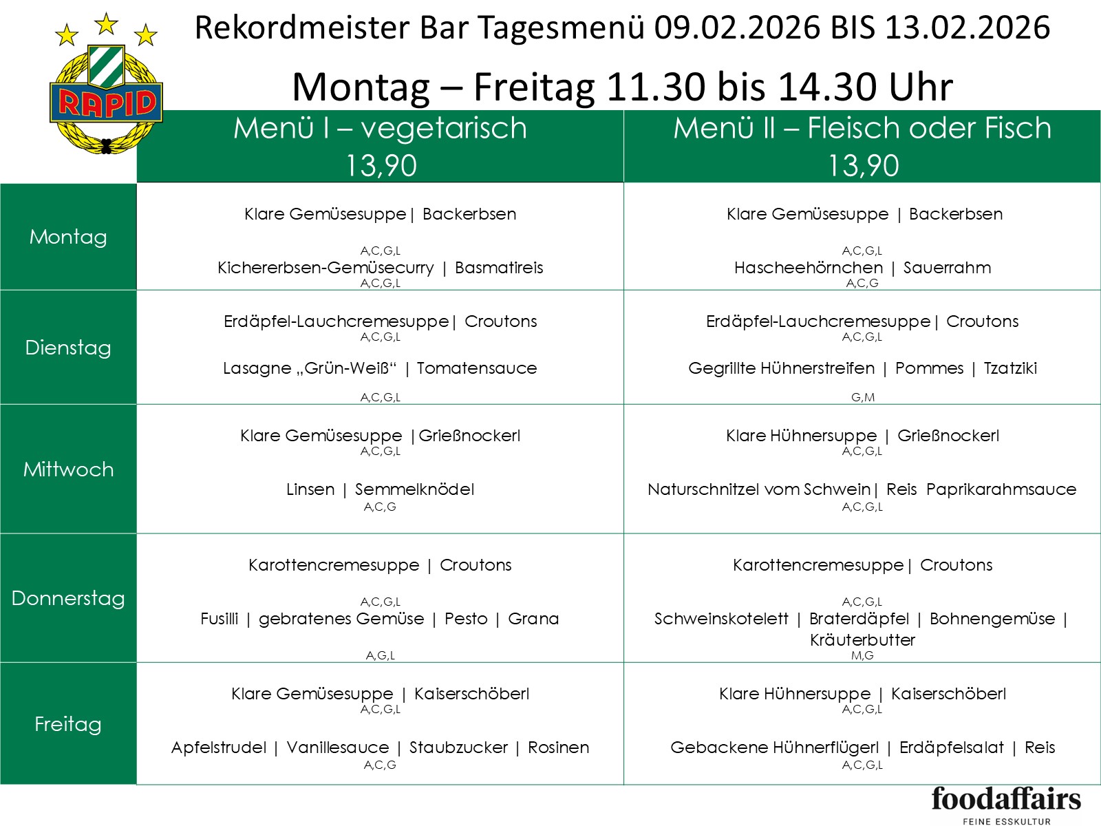 Menüplan Rekordmeister Bar vom 09. bis 13. Februar 2026