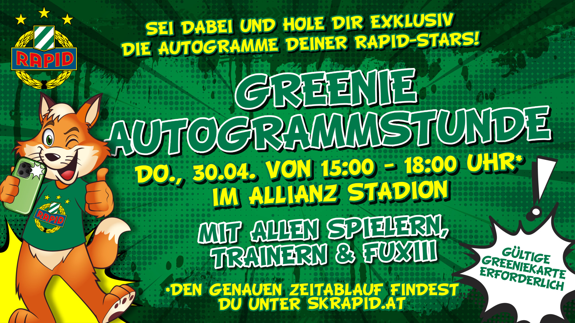 Am 30. April findet eine ganz besondere Veranstaltung in Hütteldorf statt. Wir laden alle Greenie-Mitglieder des SK Rapid zur exklusiven Autogrammstunde in das Allianz Stadion ein.