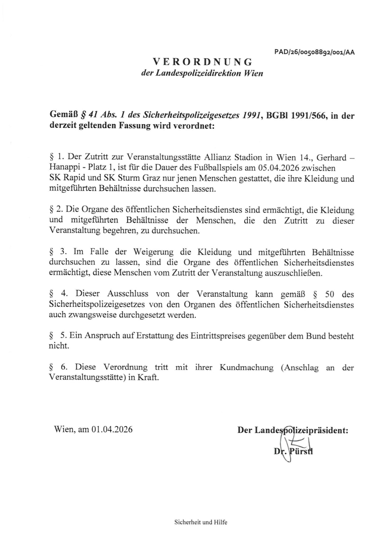 Wir bitten, nachfolgende Verordnungen der Landespolizeidirektion Wien rund um unser Heimspiel gegen den SK Sturm (Sonntag, 5. April 2026 um 17:00 Uhr im Allianz Stadion) zur Kenntnis zu nehmen!