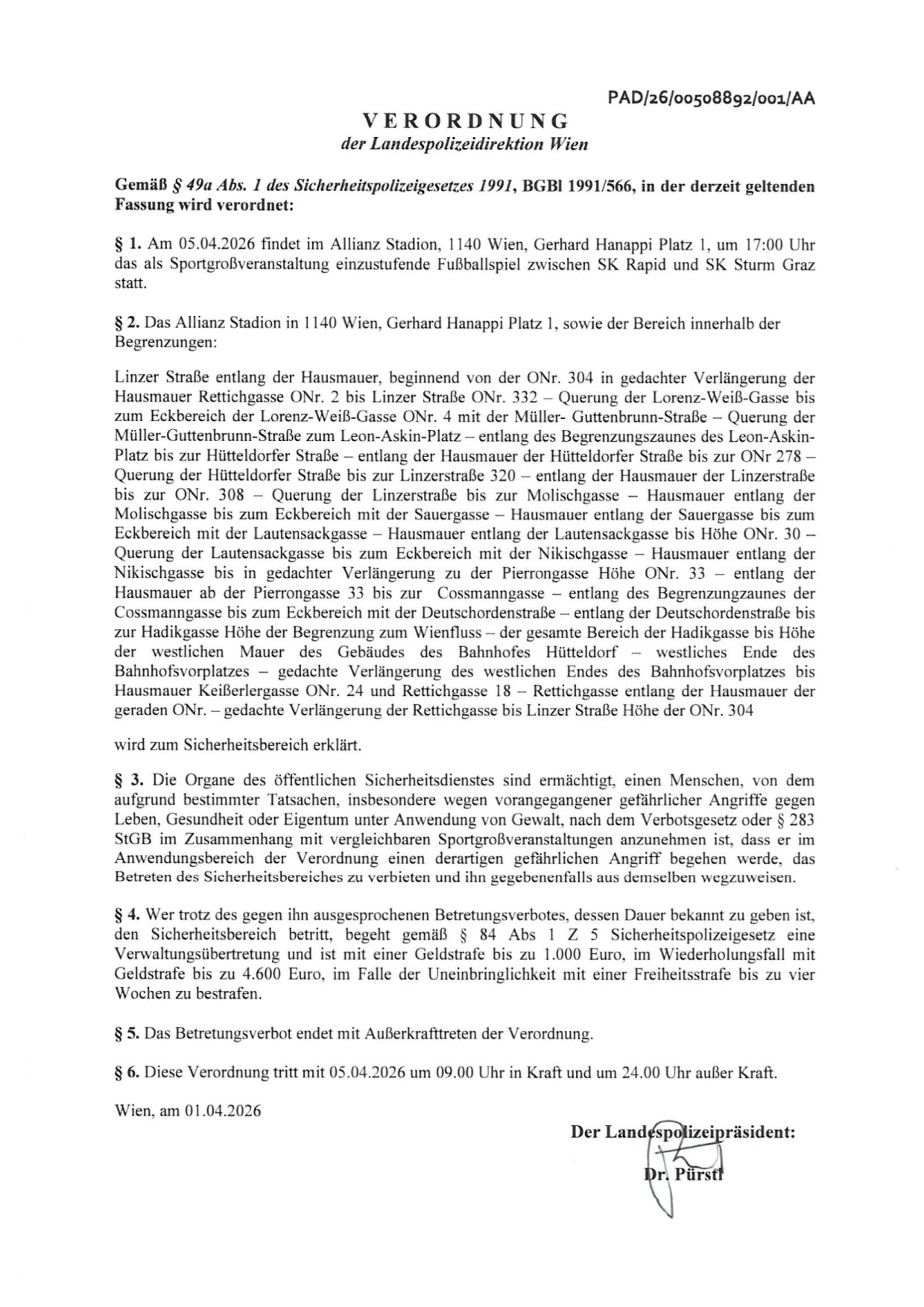 SK Rapid – SK Sturm: Verordnung LPD Wien