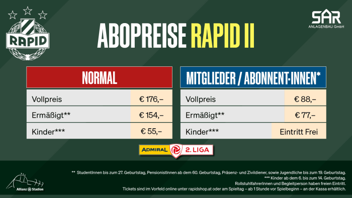 Nachfolgend findet ihr die Ticketpreise für die kommenden Rapid II-Heimspiele in der ADMIRAL 2. Liga - Vereinsmitglieder und Abonnent:innen des SK Rapid genießen dabei eine Ermäßigung! Kinder bis zum 14. Geburtstag haben freien Eintritt!