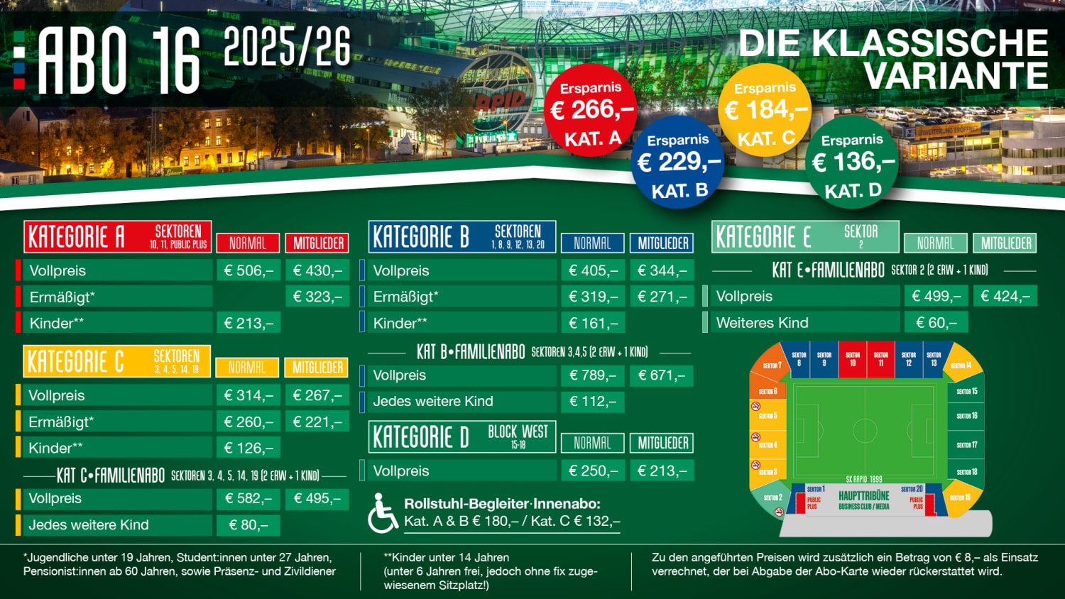 ABO16: Mit dem Abo 16 erwirbt man den persönlichen Sitzplatz für alle Heimspiele des SK Rapid in der Österreichischen Bundesliga, das heißt für 16 reguläre Meisterschafts-Heimspiele, davon 11 im Grunddurchgang und 5 in der jeweiligen Meister- oder Qualifikationsgruppe. Für Freundschafts-, Cup- und internationale Spiele haben Abo 16-Besitzer:innen ein Vorkaufsrecht auf ihren gewohnten Sitzplatz.